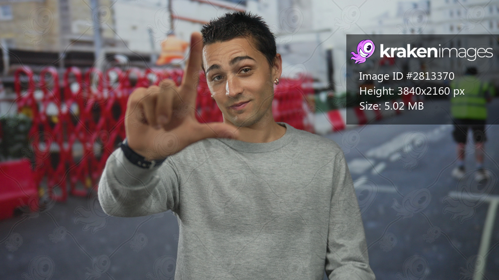 Young hispanic man wearing gray sweater showing loser sign and pointing finger at camera on street; teasing.