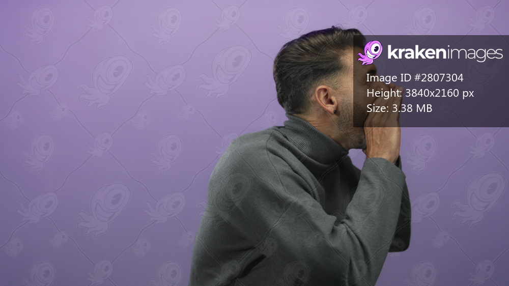 Young hispanic man wearing gray turtleneck cups hands around mouth shouting in studio with focused expression; urgency.