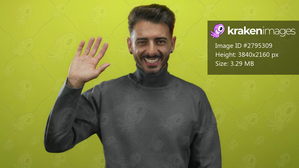Young hispanic man wearing gray turtleneck waves hand in green studio with cheerful smile; friendly greeting.