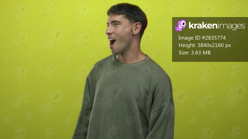 Young hispanic man wearing green sweater with open mouth shouting gesture in studio with lime green background; excitement.