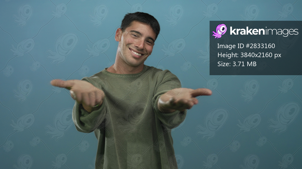 Young hispanic man wearing green sweater shows open palms against teal studio wall; openness welcome.