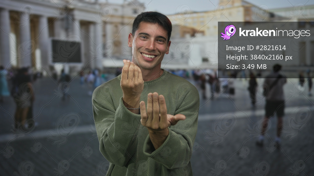 Young hispanic man wearing green sweater smiles and beckons with hands on sunlit street; friendly invitation.