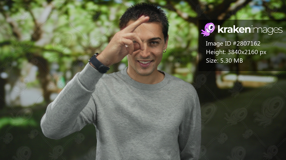 Young hispanic man wearing grey sweater finger pointing to camera in forest setting; playful invitation.