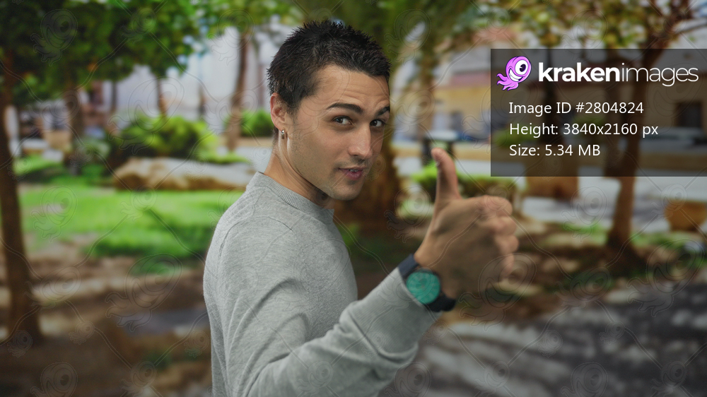 Young hispanic man wearing grey sweatshirt shows thumbs up gesture in sunlit park beside leafy trees and stone bench; optimism.