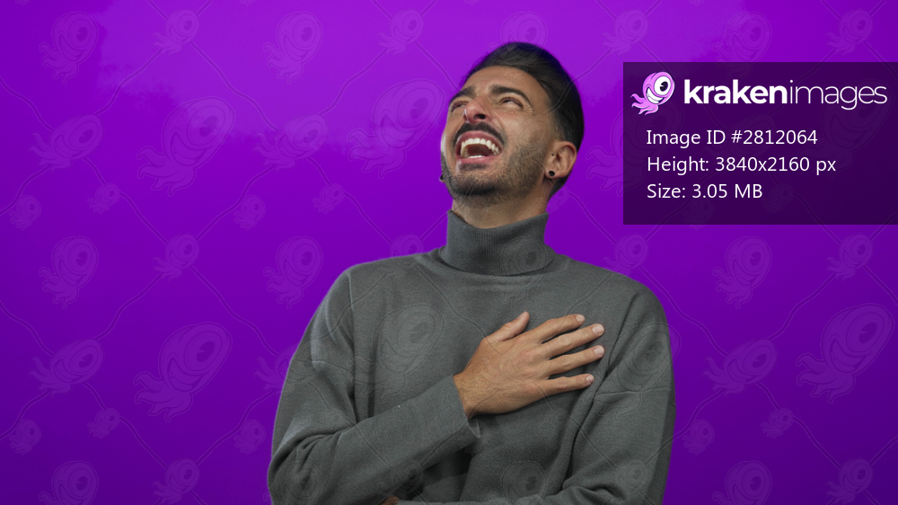 Young hispanic man wearing grey turtleneck clutch chest laughing tilting head back in purple studio; happiness.