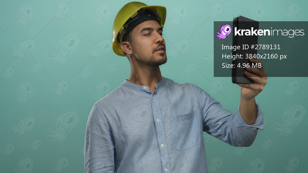 Young hispanic man wearing hardhat makes a video call holding a tablet against isolated green background, showcasing technology use in construction settings. - Kraken Images