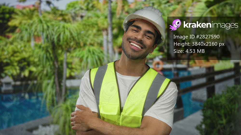 Young hispanic man wearing hardhat and neon vest with arms crossed beside pool at building; confidence pride optimism ambition.