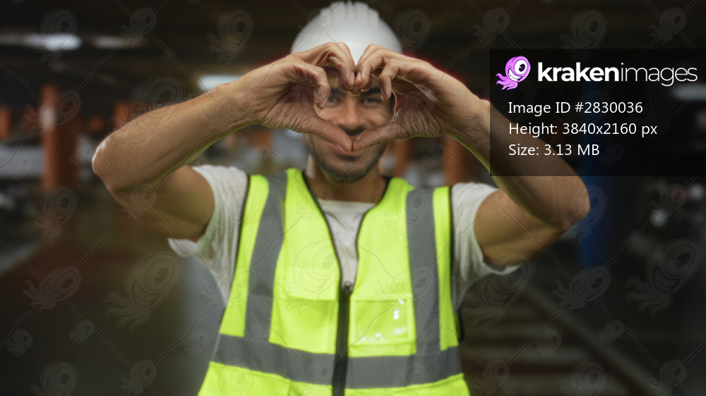 Young hispanic man wearing hardhat and reflective vest forms heart with hands in building; love happiness.
