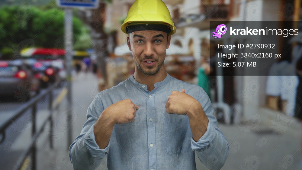 Young hispanic man wearing hardhat smiling and celebrating on a bustling city street with blurred background of cars and shops.