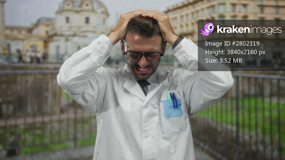 Young hispanic man wearing lab coat holds head in building ruins near ancient columns overgrown with grass; stress.