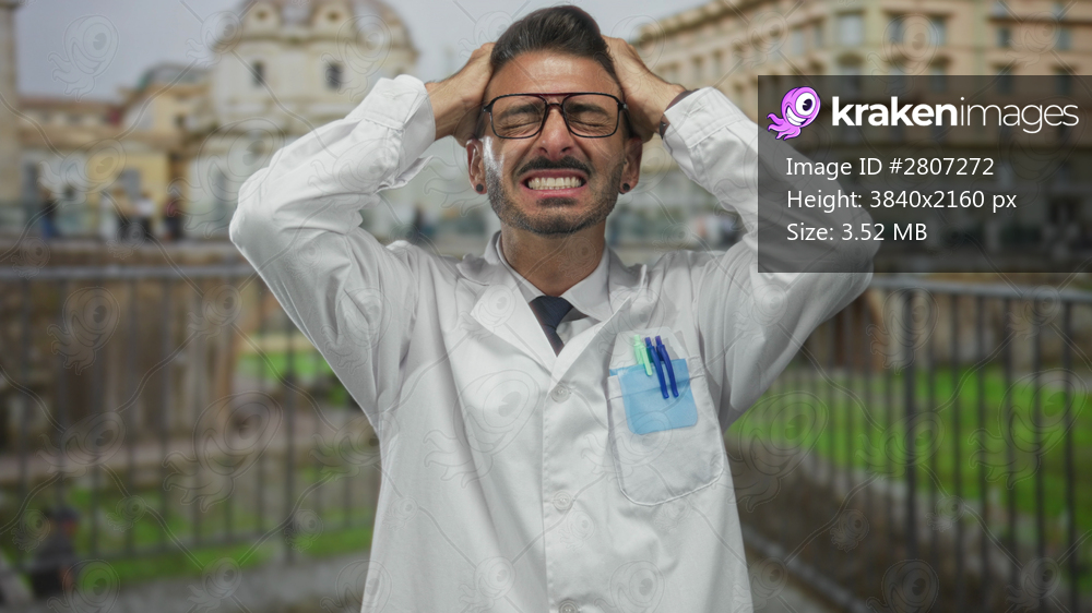 Young hispanic man wearing lab coat holds head in building ruins near ancient columns overgrown with grass; stress.