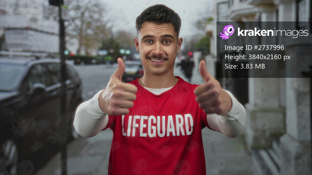 Young hispanic man wearing lifeguard shirt giving thumbs up outdoors on a city street.