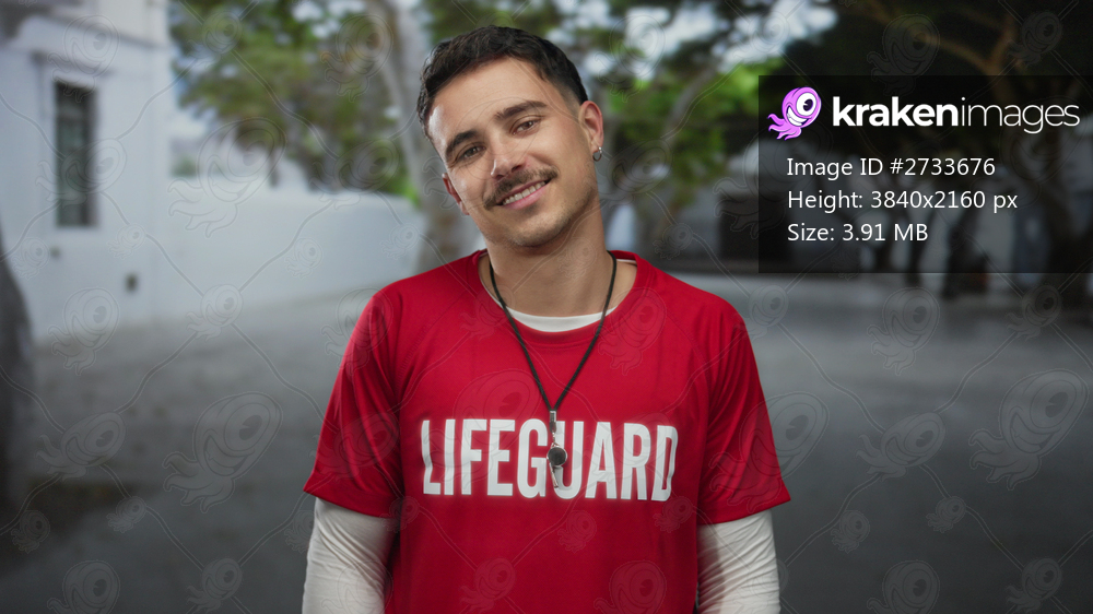 Young hispanic man wearing lifeguard shirt on city street smiling outdoors in vibrant setting with trees and buildings.
