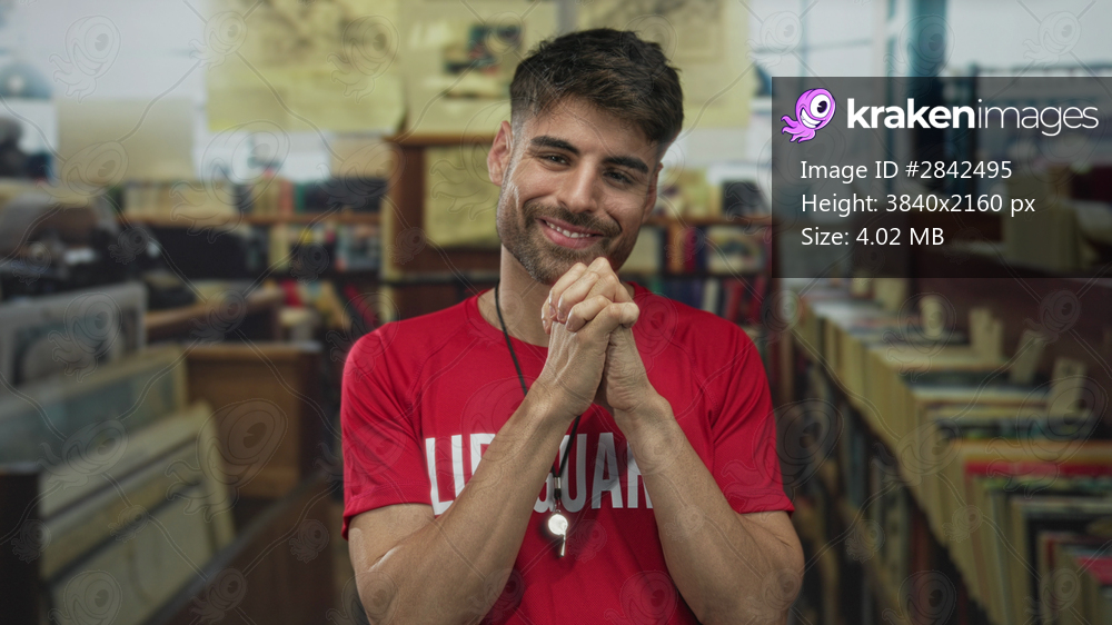 Young hispanic man wearing lifeguard shirt and whistle clasping hands in library building; hope determination.