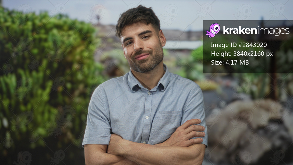 Young hispanic man wearing light blue shirt with arms crossed smiling in green park under bright sunlight; confidence.