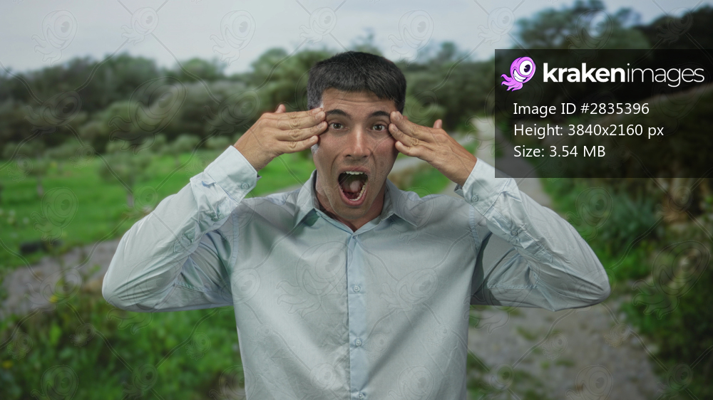 Young hispanic man wearing light blue shirt presses temples with hands on green forest path; surprise.