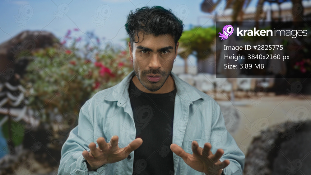 Young hispanic man wearing light denim shirt with palms raised in calming gesture on building terrace under sunlight; serenity.