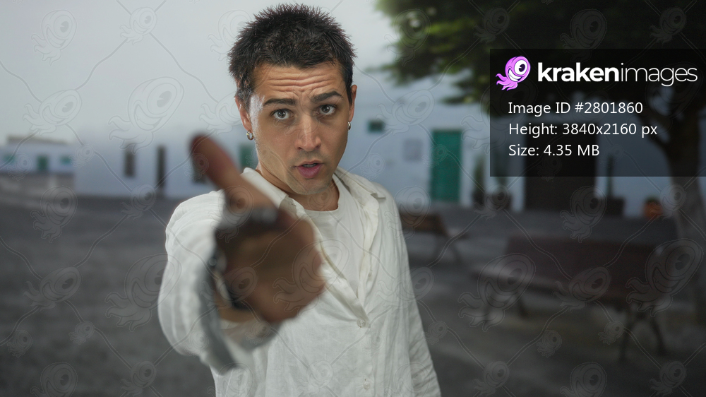 Young hispanic man wearing loose white shirt points finger to camera on street showing hoop earrings; anger frustration tension confrontation.