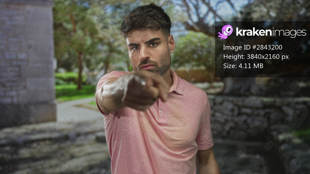 Young hispanic man wearing pink polo shirt pointing index finger at camera in green outdoor park; determination.
