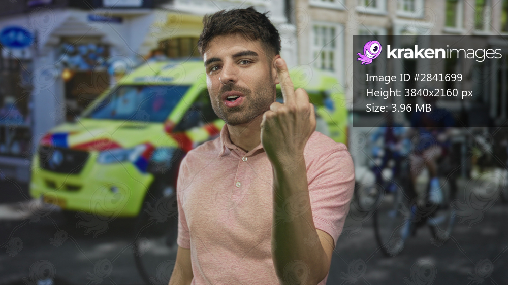 Young hispanic man wearing pink shirt shows raised middle finger on crowded city street; bold defiance.