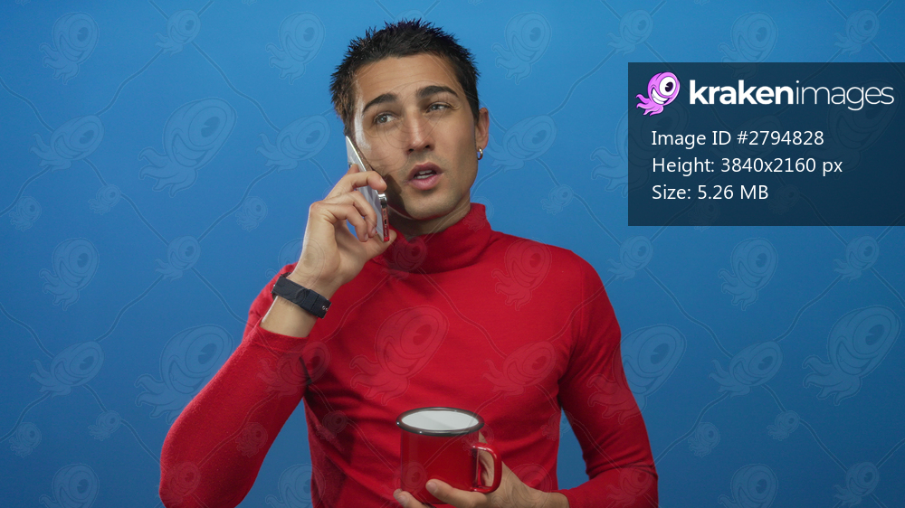 Young hispanic man wearing red sweater talks on smartphone while holding coffee cup in studio; serenity calm focus contemplation.