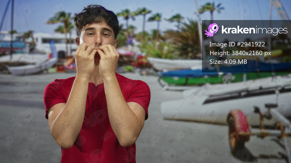 Young hispanic man wearing red t shirt with hands to mouth beside colorful boats on a sunny street; playful anticipation.