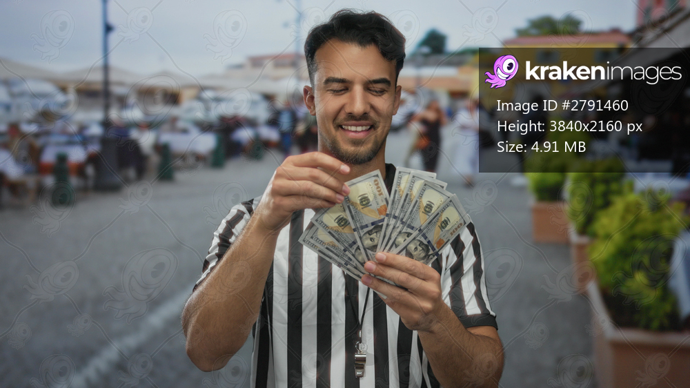 Young hispanic man wearing referee outfit counts us dollar bills on busy city street with outdoor dining