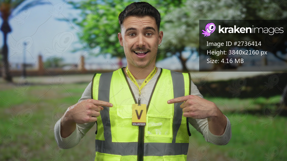 Young hispanic man wearing reflective vest as volunteer in outdoor park setting showcasing community service involvement