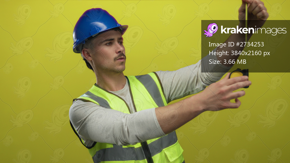 Young hispanic man wearing reflective vest and hardhat measures with tape against isolated yellow background wall suggesting construction work.