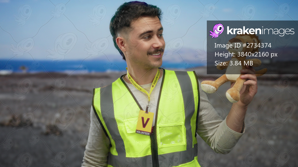 Young hispanic man wearing reflective vest holds plush toy on seaside beach showing volunteer badge with ocean view in background its blue sky emphasizing community effort - Kraken Images