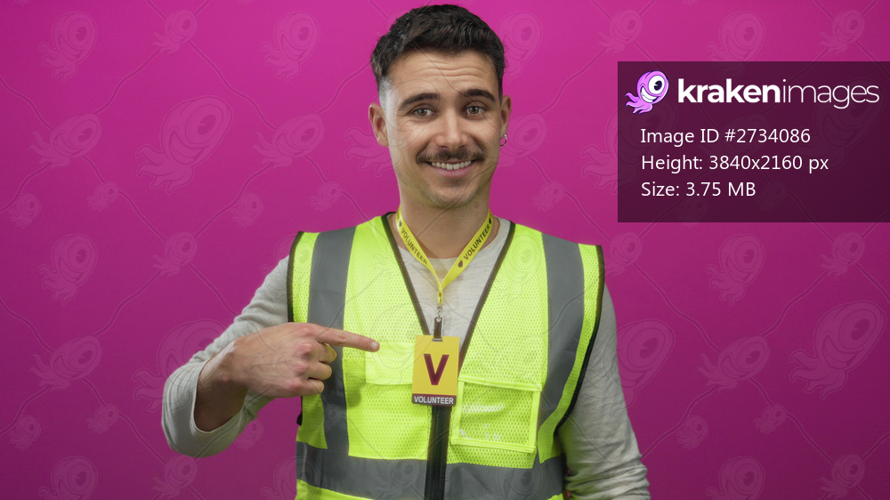 Young hispanic man wearing reflective vest points to volunteer badge against isolated pink wall background