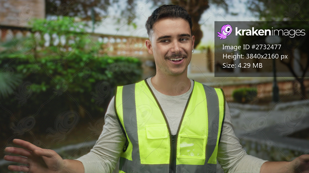 Young hispanic man wearing reflective vest standing on city street outdoors surrounded by greenery and brick walls during daylight showcasing safety and urban environment - Kraken Images