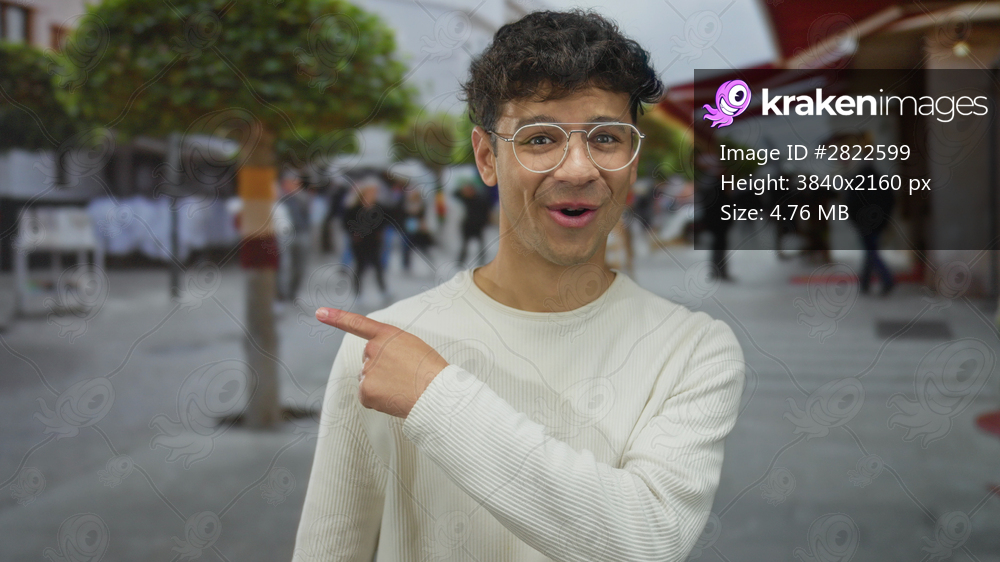 Young hispanic man wearing round glasses points finger to left on bustling downtown street; optimism.