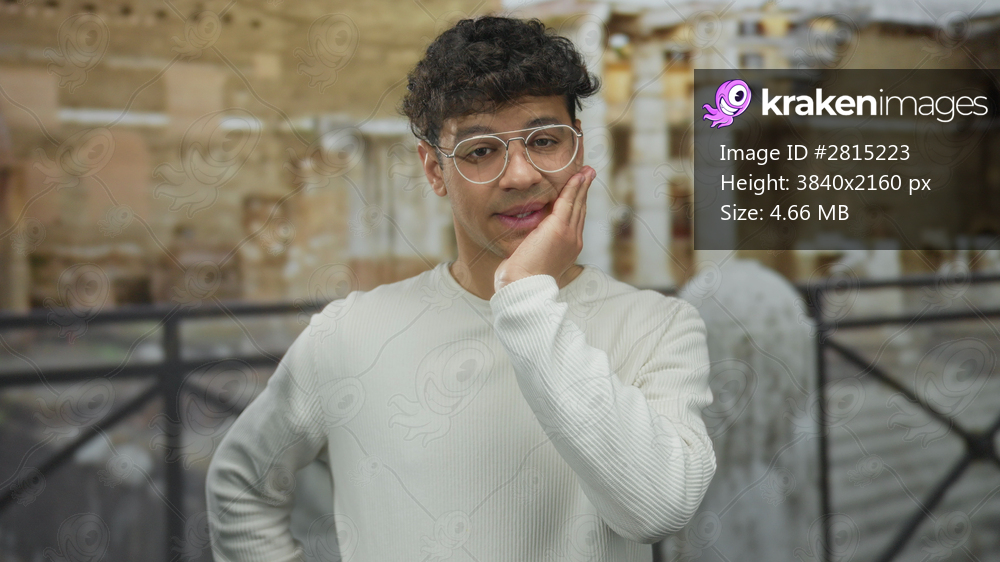 Young hispanic man wearing round glasses touches cheek with hand at ancient stone building ruins of roman era; discomfort.