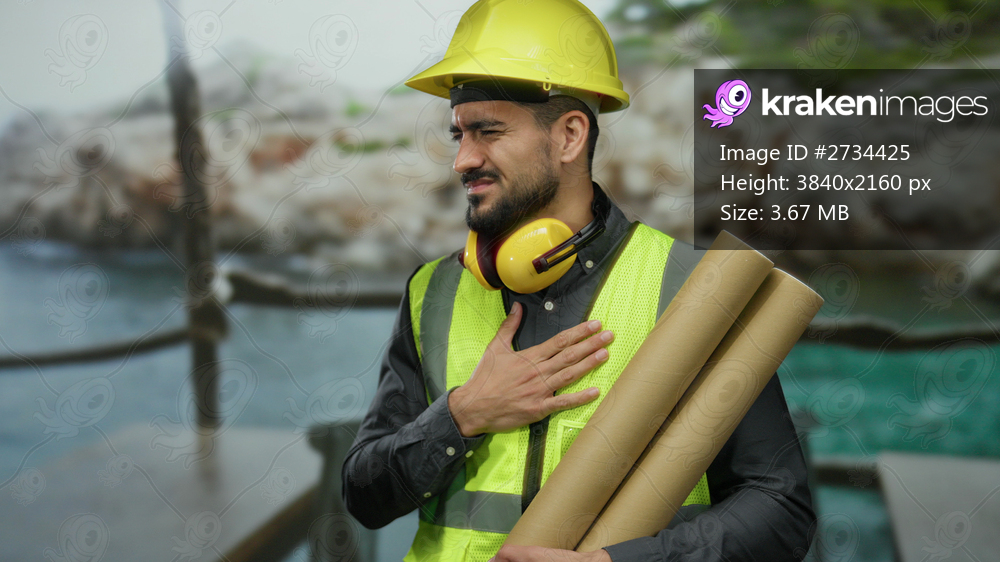 Young hispanic man wearing safety equipment appears to cough while holding blueprints at a seaside location