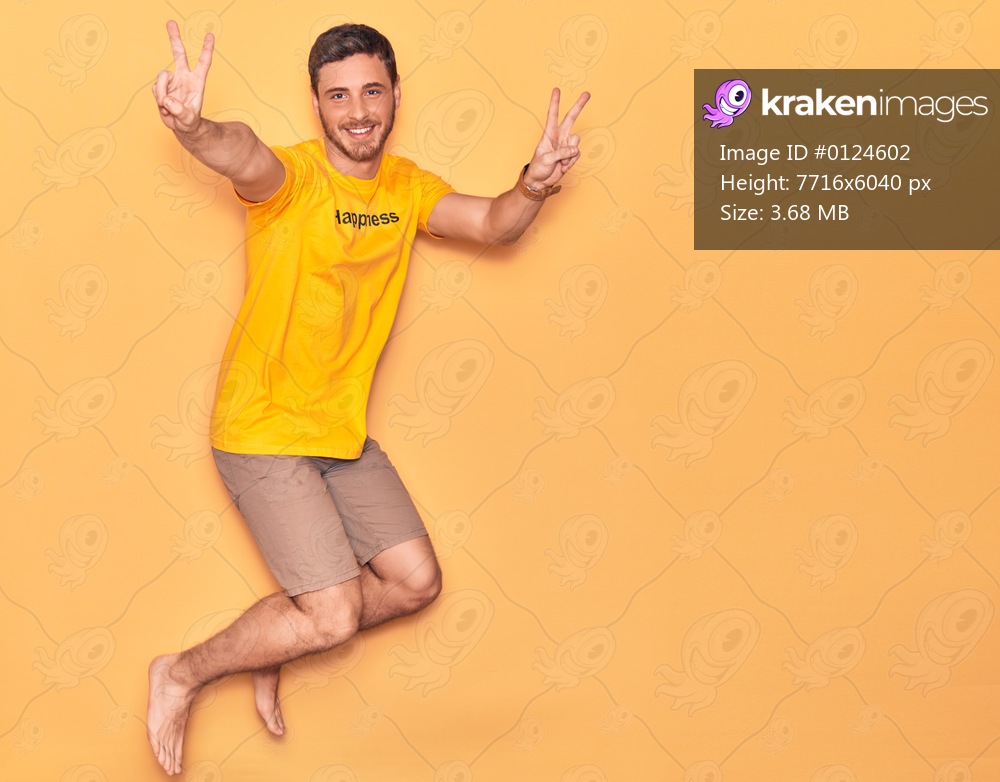 Young hispanic man wearing t shirt with happiness word message smiling happy. Jumping with smile on face doing victory sign over isolated yellow background - Kraken Images