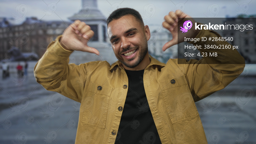 Young hispanic man wearing tan jacket shows two thumbsdown gesture on street with blurred city square behind; disapproval.