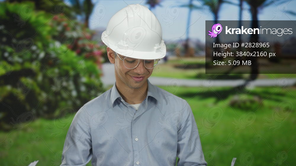 Young hispanic man wearing white hardhat holds large rolled blueprints and smiles in forest; confidence.