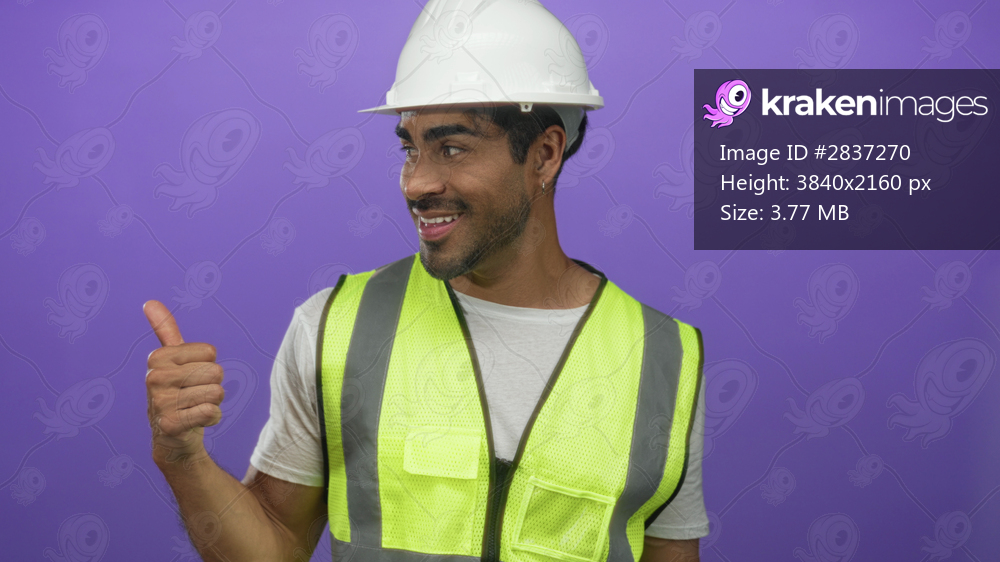 Young hispanic man wearing white hardhat and yellow reflective safety vest giving thumbs up gesture in purple studio; confidence motivation optimism success. - Kraken Images