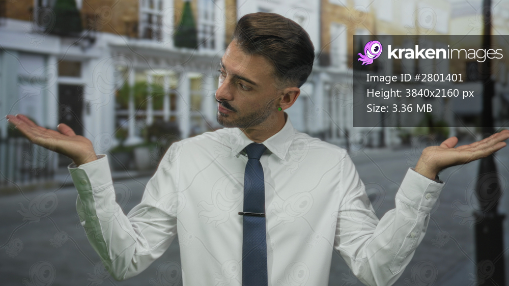 Young hispanic man wearing white shirt and blue tie holding open palms on daytime urban street; uncertainty.