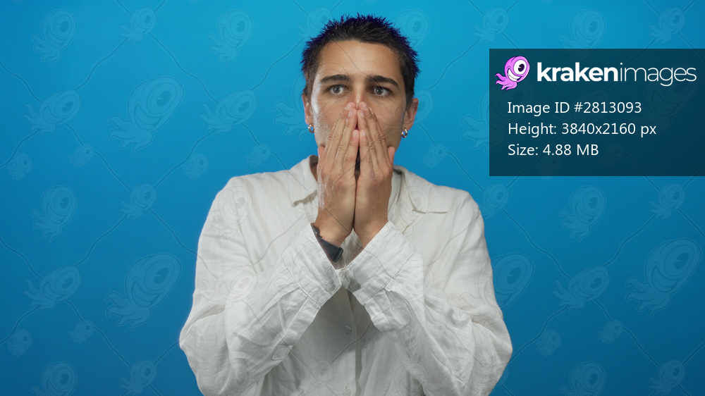 Young hispanic man wearing white shirt expresses surprise over isolated blue background wall creating an engaging setting.