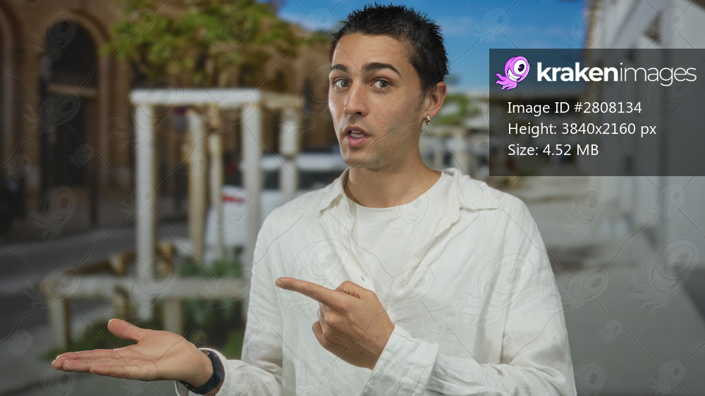Young hispanic man wearing white shirt extends his palm and points a finger to it on a sunny street in daylight; invitation guidance curiosity.