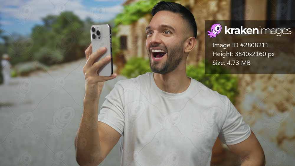 Young hispanic man wearing white shirt having a video call with a smartphone outdoors on a cobblestone street in an old town city setting with greenery and rustic buildings. - Kraken Images