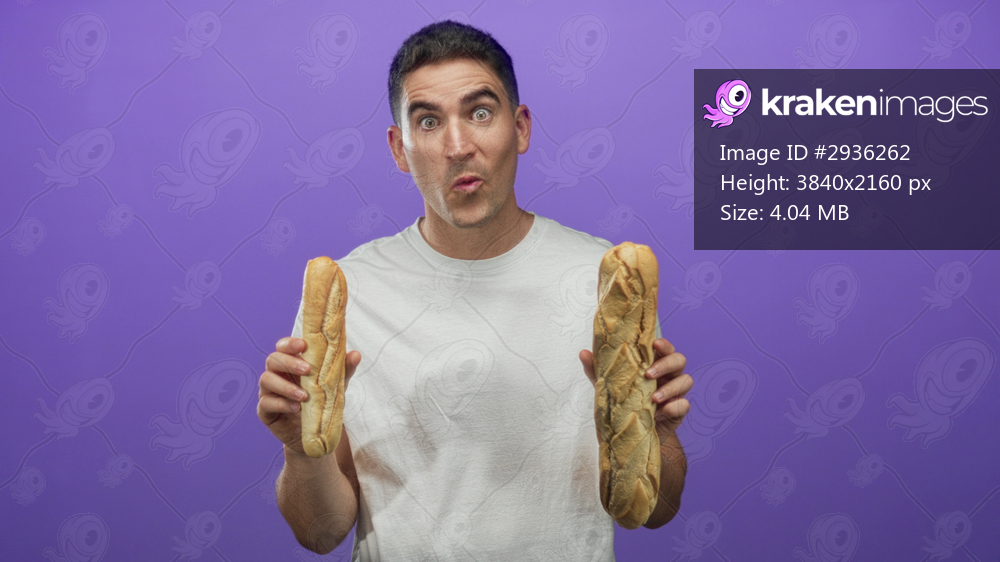Young hispanic man wearing white shirt holding two baguettes with open mouth gesture in purple studio; surprise humor.
