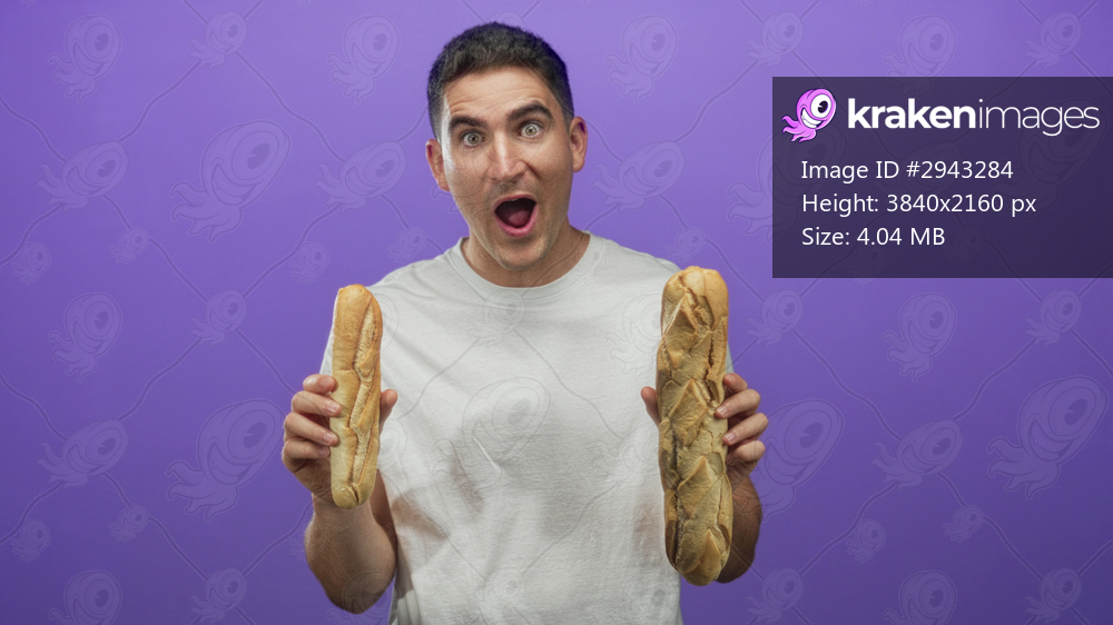 Young hispanic man wearing white shirt holding two baguettes with open mouth gesture in purple studio; surprise humor.