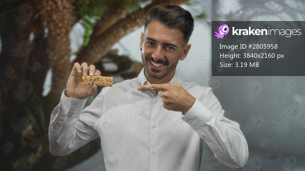 Young hispanic man wearing white shirt holds granola bar and points finger to snack among leafy branches in forest; joy health nutrition.