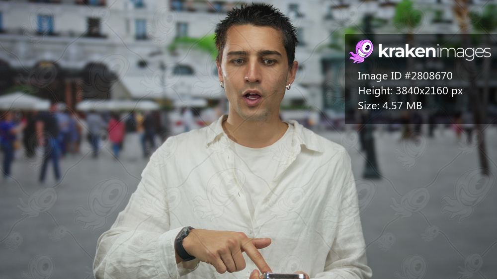 Young hispanic man wearing white shirt points index finger to smartphone screen on busy urban street; digital concentration.