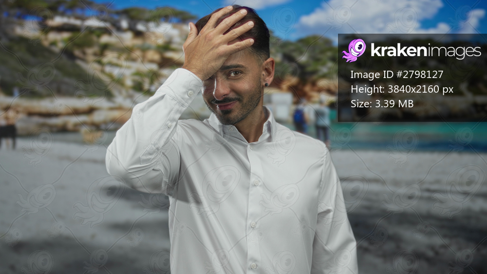 Young hispanic man wearing white shirt resting hand on forehead at sunny seaside beach under blue sky; introspection.