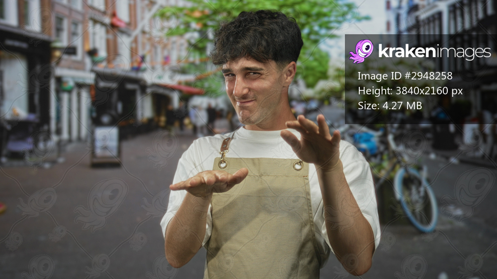 Young hispanic man wearing white t shirt and beige apron holds hands apart in measuring gesture on city street; playful confidence.