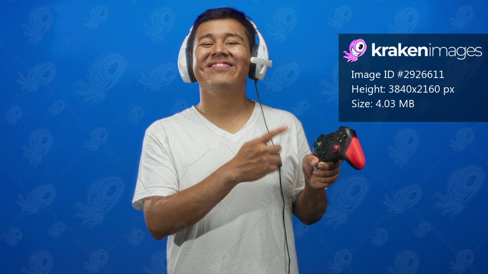 Young hispanic man wearing white t shirt and headset holding a game controller and pointing finger in blue studio; joy gaming fun.